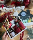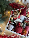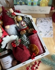 Дерев’яна коробка у формі будиночка з новорічним принтом «З Новим Роком та Різдвом», наповнена святковими сюрпризами: • Новорічна карамель у баночці • Плюшевий гномик • Палочка для карамелі • імбирний пряник ручної роботи • Зимовий листовий чай у мішечку • Свічка для святкового столу • 5 шоколадних цукерок Ferrero Rocher • Скляний снежний шар-сувенір • Натуральна ялинка Nobilis, апельсинові чипси та шишки для декору
