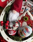 Дерев’яна коробка у формі кіндер-сюрпризу, наповнена святковими сюрпризами: • Плюшевий гномик • Пряник ручної роботи у вигляді будиночка • 2 батончики Kinder Country • 2 шоколадки Kinder Joy / Kinder Chocolate • 2 Kinder Surprise • Скляний новорічний снежний шар • Цукерка-посох • Декор: натуральна ялинка та ягоди