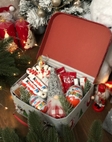 Склад набору: • Плюшевий гномик • 2 яйця Kinder Surprise • 2 батончики KitKat • 4 шоколадки Kinder Шоколад • 2 шоколадки Kinder Eagle • 1 батончик Kinder Country • Пряник ручної роботи у формі снежинки • Імбирний пряник • Декор із живої ялини Nobilis • Декор із штучних ягід • Открытка, лист Санти та розмальовка